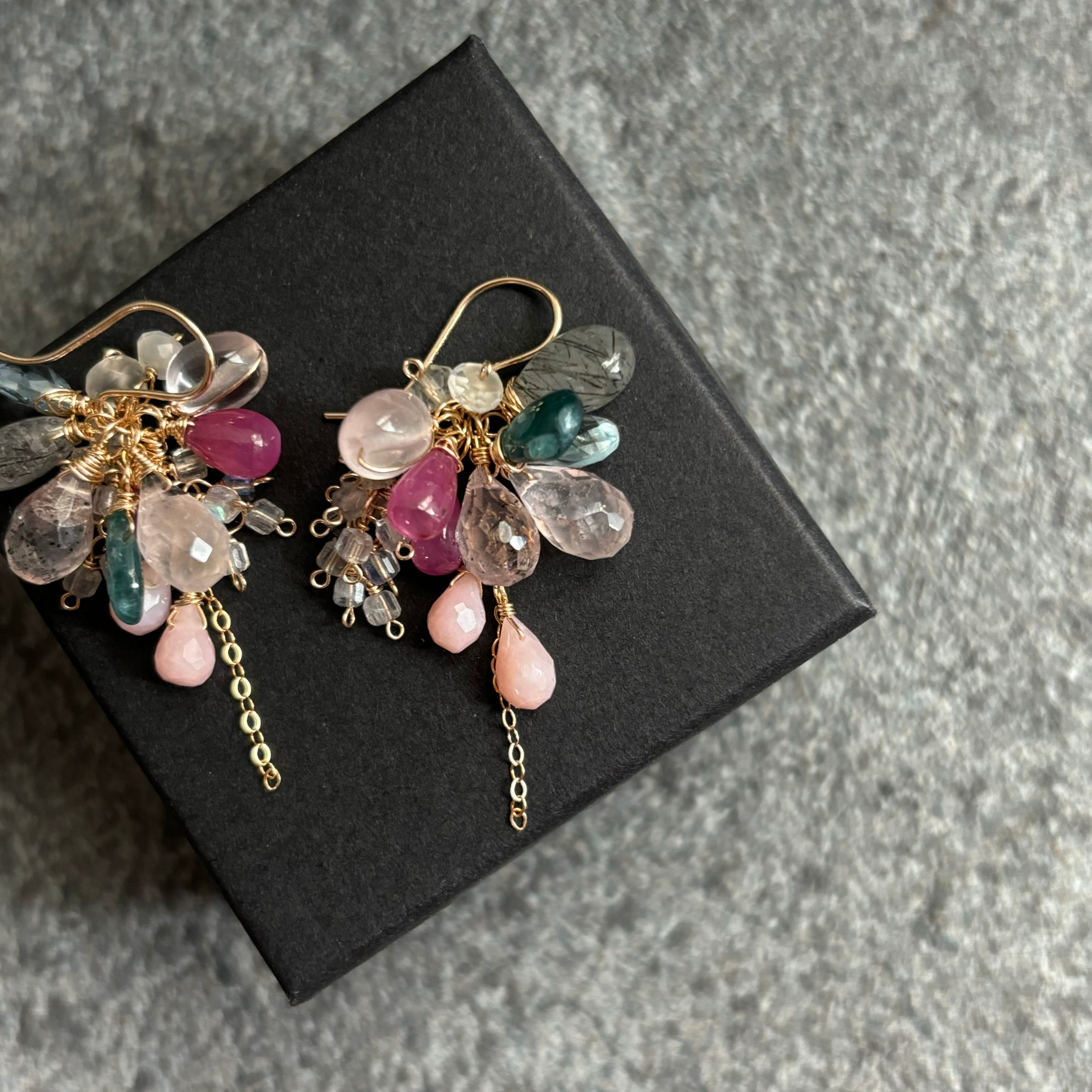 非加熱の美しいルビーを主役に、様々な天然石を贅沢に組み合わせた魅力的なピアスです。揺れるチェーンは、ルビーの華やかさを引き立て、添えられたピンクオパール、ローズクオーツ、ドットクオーツ、ブルームーンストーンの柔らかい色合いが、耳元で優雅に揺れ動きます。そして、アクセントに加えられたグリーンのグランディディエライトが、全体のデザインに奥行きをプラスし、独自の美しさを表現しています。
