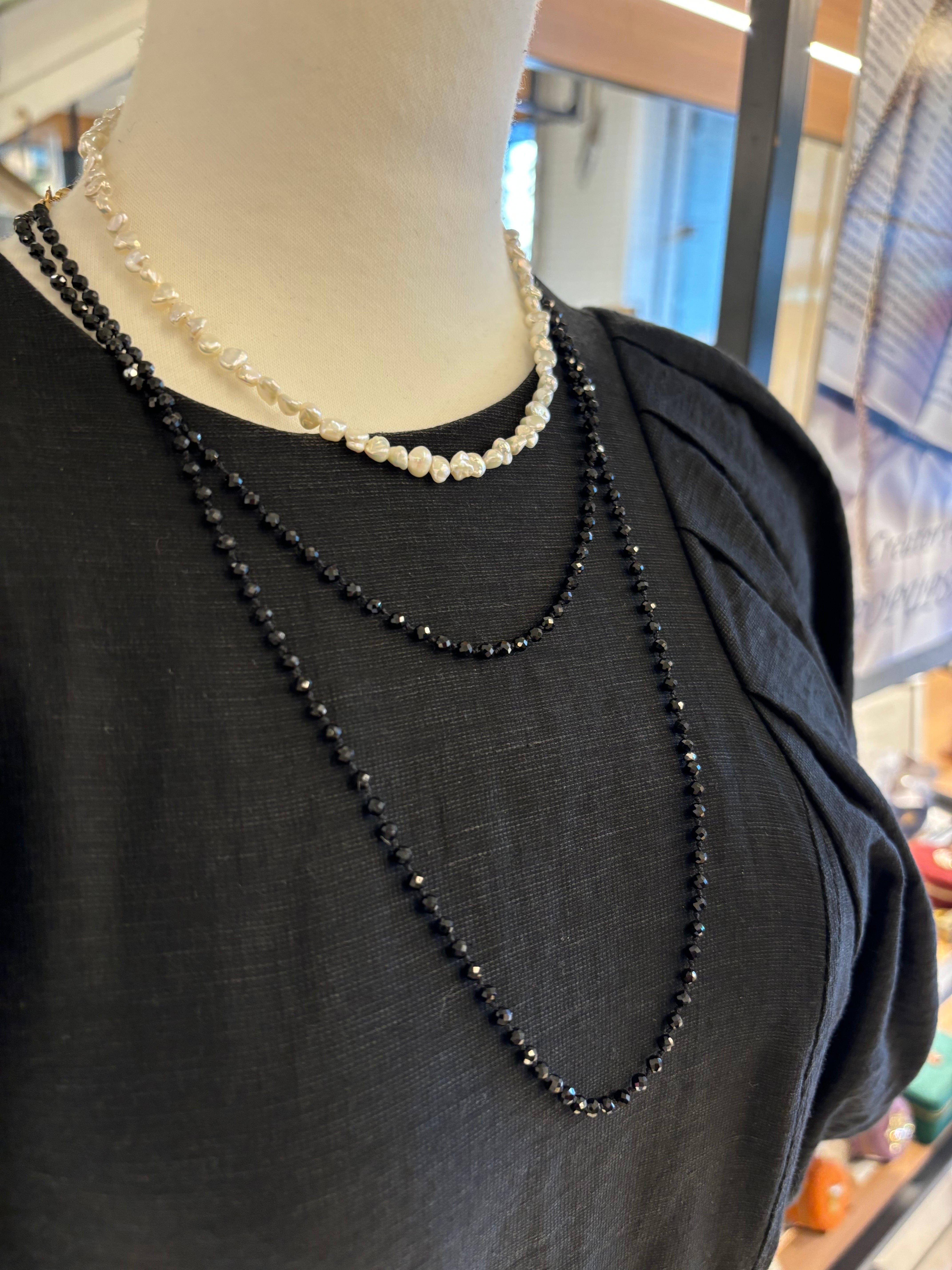 美しい輝きを放つブラックスピネルを使用した、洗練されたオールノットのロングネックレスです。全長約100センチ、カット玉のブラックスピネルをシルク糸でひと玉ずつノットを作って仕上げた、贅沢な、そして自由なスタイリングが楽しめるアイテムとなっています。