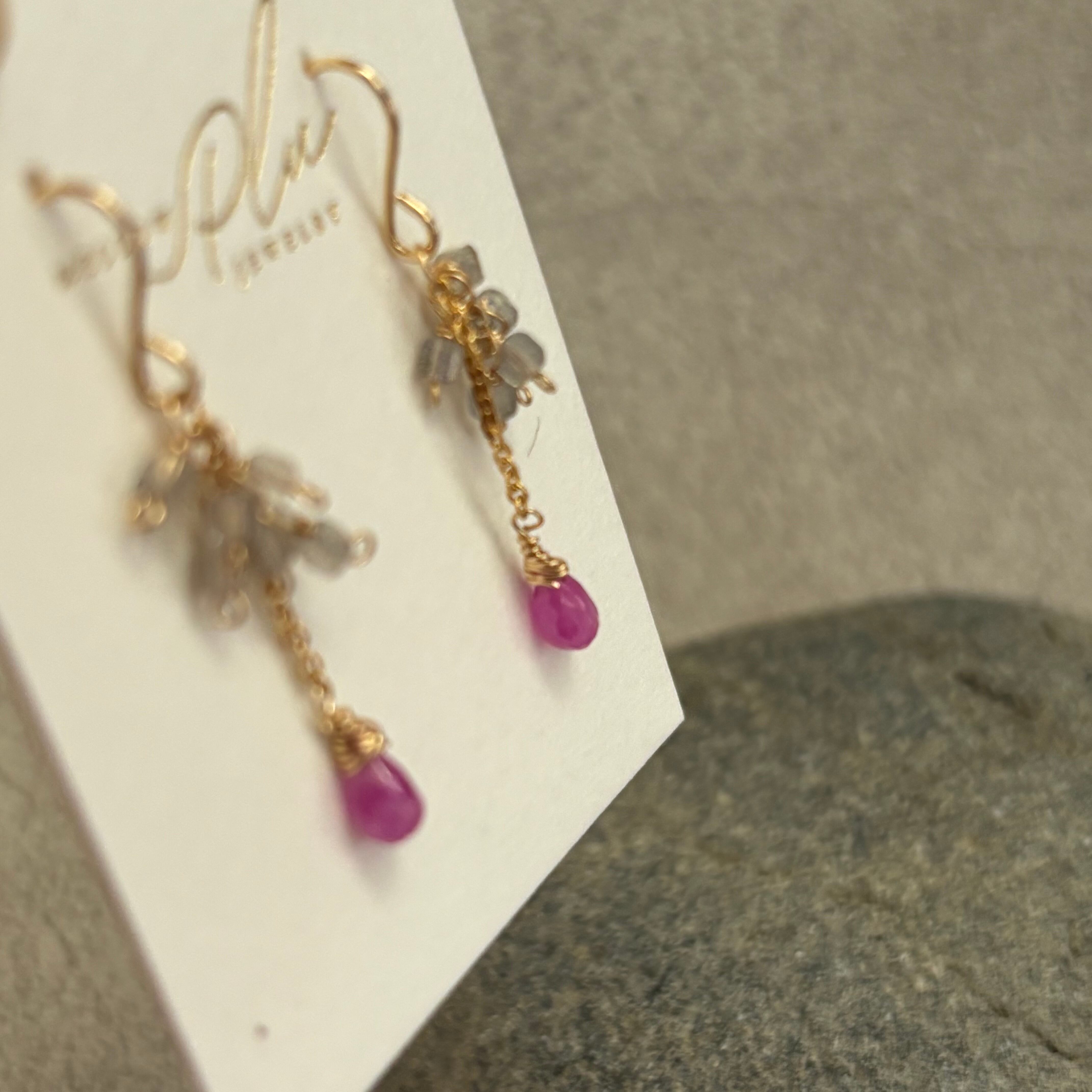モゴック産の天然ルビーが小さく揺れる、優美なピアスです。深みのあるルビーが耳元で軽やかに揺れ、特別な輝きを添えます。さらに、極小のキューブカットのラブラドライトが優しく輝き、全体を繊細に仕上げています。カジュアルなスタイルにも、フォーマルなシーンにもぴったりのアイテムで、どんな装いも華やかに引き立ててくれることでしょう。