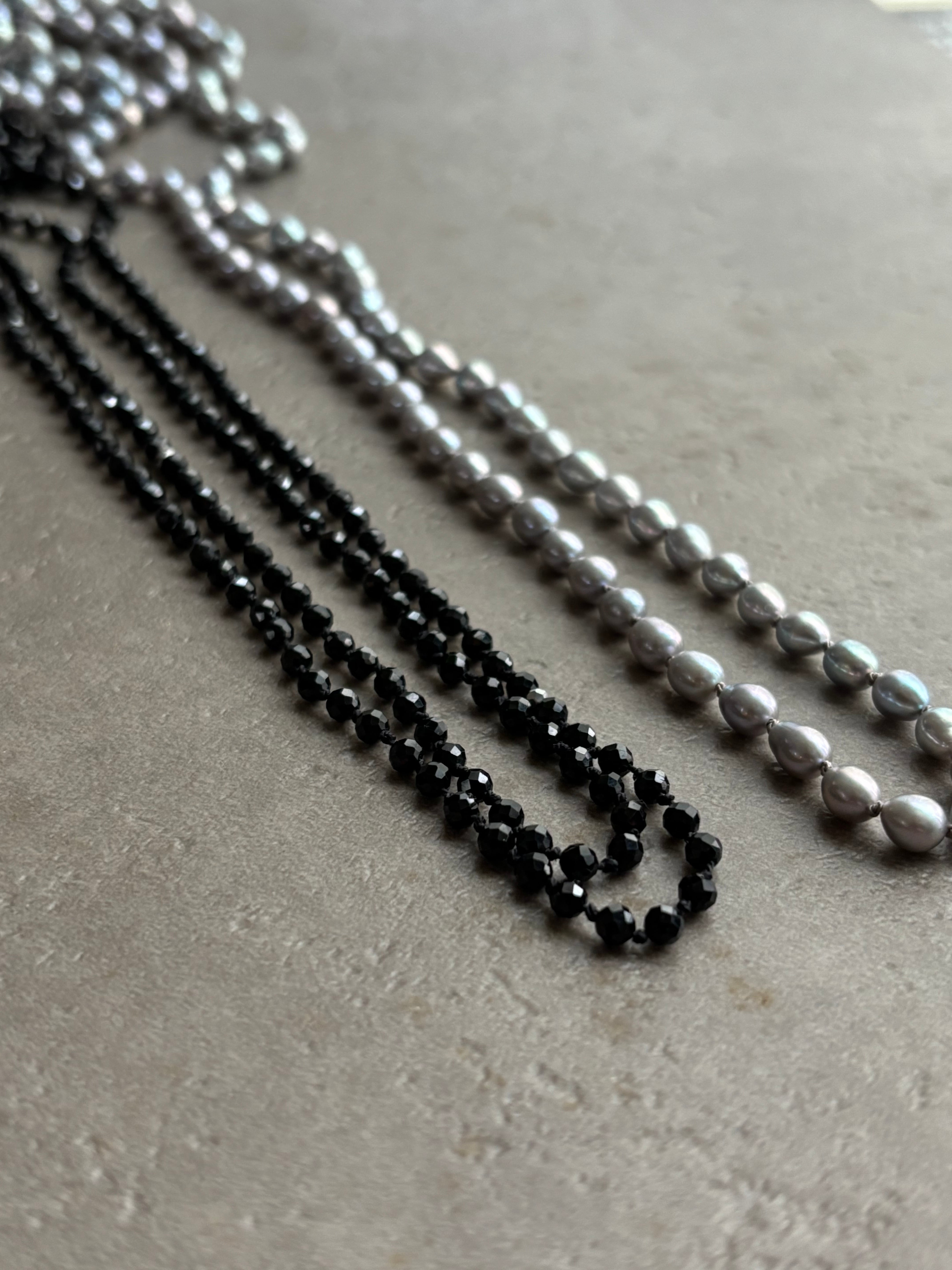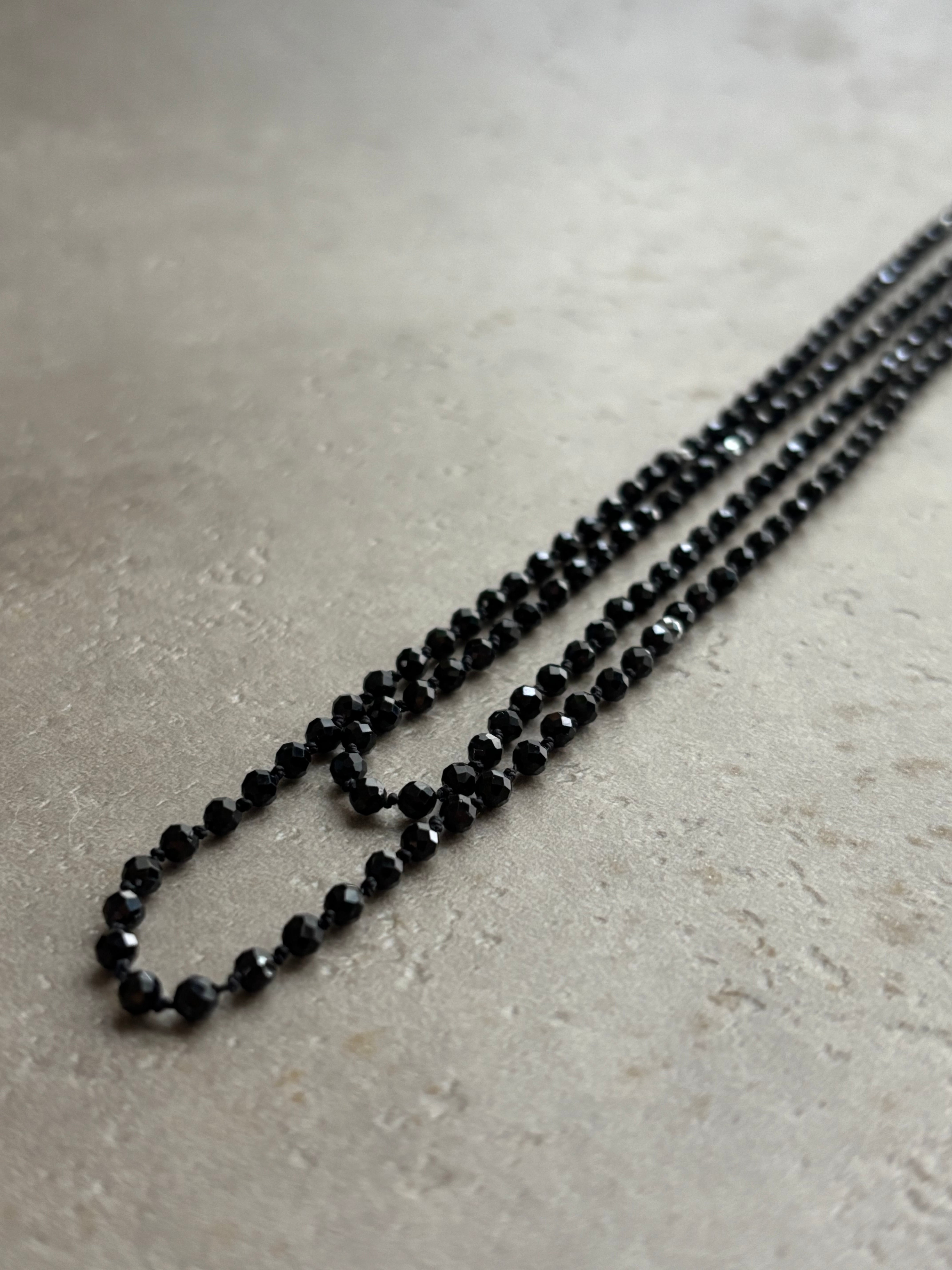 美しい輝きを放つブラックスピネルを使用したオールノットロングネックレスです。3ミリ玉の約300粒がシルクの糸で一粒ずつ丁寧に結ばれ、洗練された印象を与えます。カット面が煌めくブラックスピネルは、まるでブラックダイヤのような艶やかな輝きを持ち、装飾的な存在感を引き立てます。2連にしても。